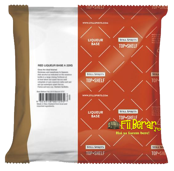 Agitati bine inainte de utilizare. Amestecati usor baza pentru lichior A cu 850 ml alcool 40% ABV. Adaugati esenta si completati cu apa pana la 1.125 litri.